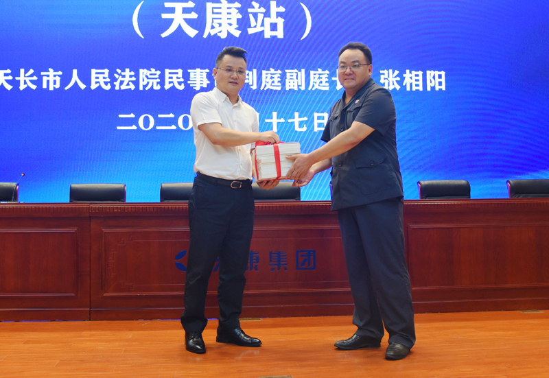 天長(zhǎng)市人民法院副院長(zhǎng)董茂軍代表天長(zhǎng)市人民法院向安徽天康集團(tuán)贈(zèng)送《中華人民共和國(guó)民法典》,集團(tuán)總經(jīng)理毛文章代表安徽天康集團(tuán)接受捐贈(zèng)。